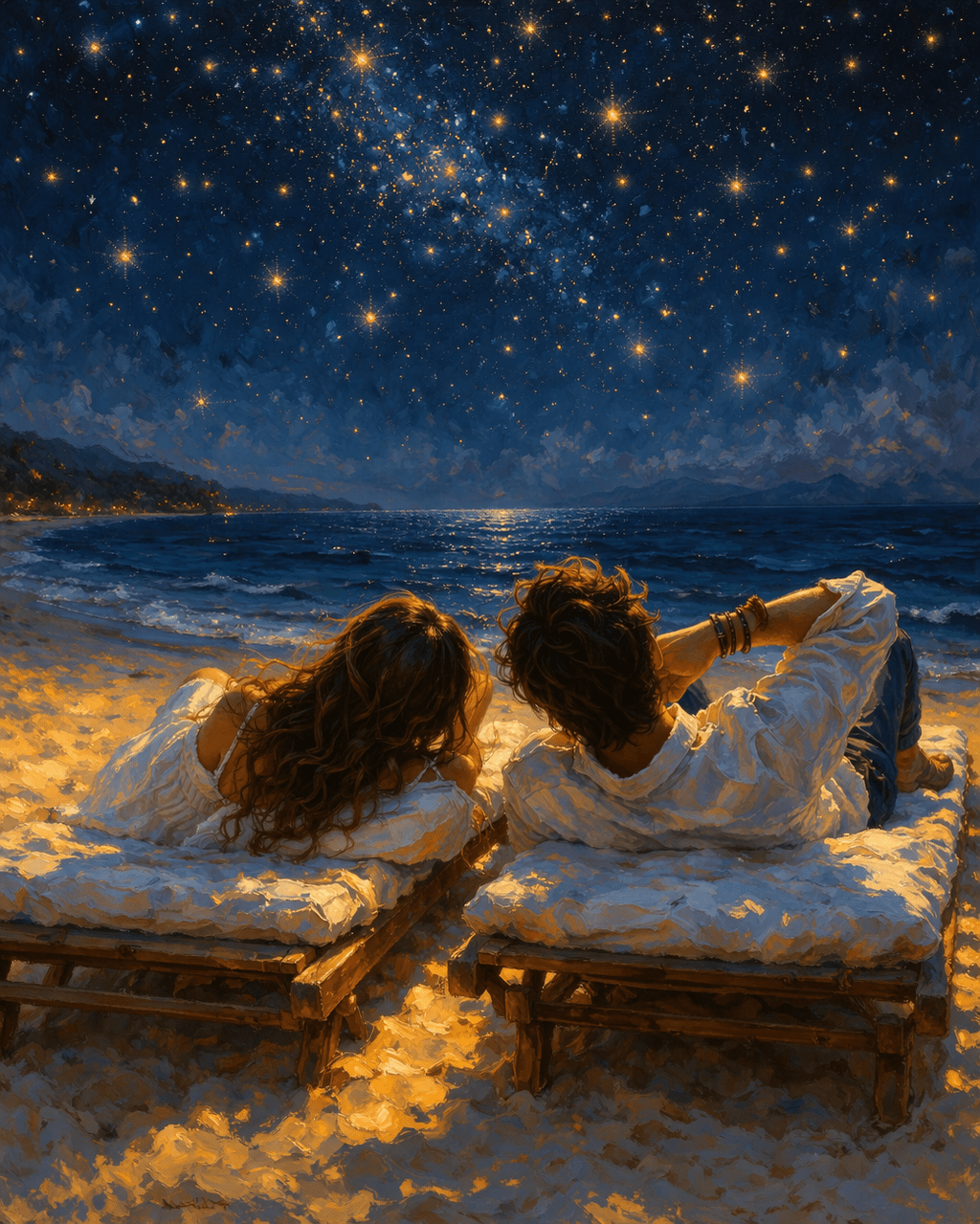 […] Si sdraiarono sui lettini e cominciarono a guardare le stelle, continuando a parlare e a ridere.